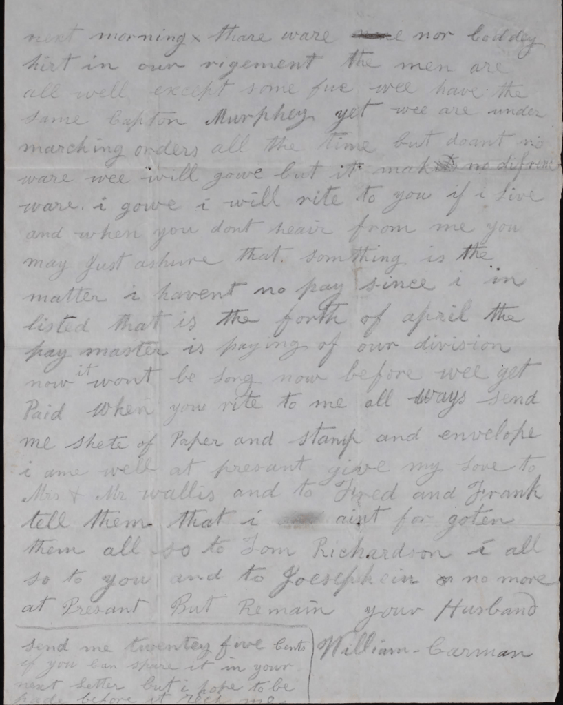Captain [Patrick] O’Murphy is out here but hasn’t taken command of his company yet. He come on the 14th of March. His leg is very bad. I don’t think he ever will be able to take command of us. I would have wrote sooner but thinking the pay master would be here every day so I could send you some money. I hope by the time this reaches you that I may be paid for it has been seven months since I got any money and I know that you must stand in need of some. No more at present but I send you my love to you and Josephine….Very respectfully your husband, — William Carman