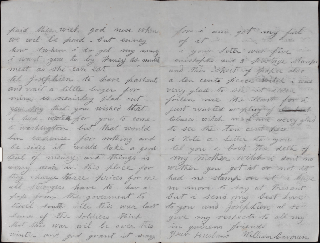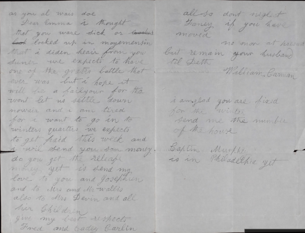 I had to send twenty dollars to Baltimore which leaves me five after I send you some more. We will get paid every two months now so the paymaster says and that won’t be long a coming now and I can send you more money. Don’t forget Fanny. Be sure to get some meat for her. I send my best love to you and Josephine. Give my best respects to Fred and Frank and to Mr. and Mrs. Wallace. You can tell them that I am well and if I live to come home, I mean to have a good time of it. No more at present but remain your husband, — William Carman.