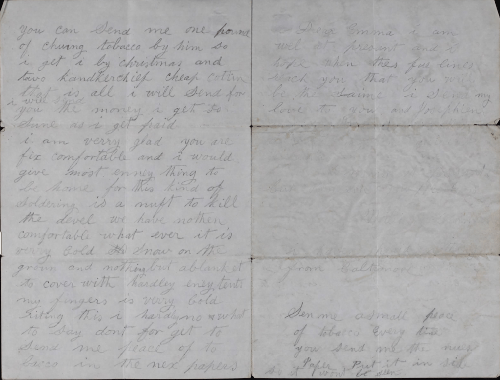 Dear Emma, I am well at present and I hope when these few lines reach you, that you will be the same. I send my love to you and Josephine. Send me a small piece of tobacco every time you wend me the newspaper. Put it inside so it won’t be seen.