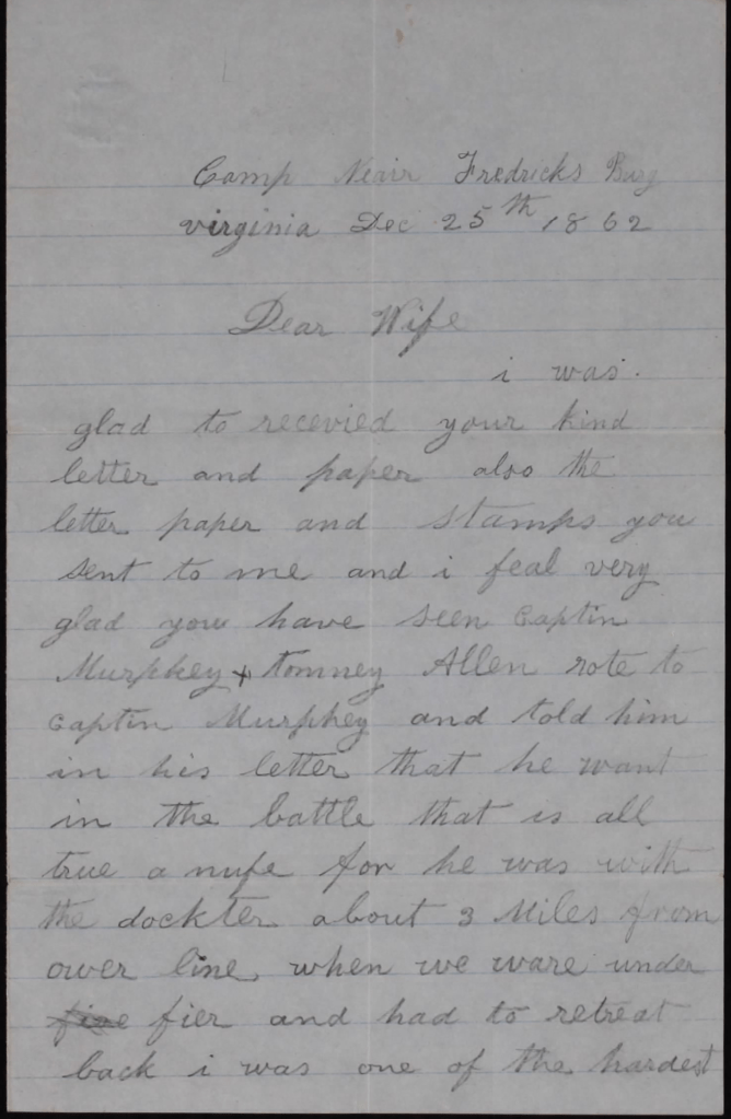 I was glad to receive your kind letter and paper. Also the letter paper and stamps you set to me. And I feel very glad you have seen Captain O’Murphy and Tommy Allen wrote to Captain O’Murphy and told him in his letter that he wasn’t in the battle. That is all true enough for he was with the doctor about three miles from our line when we were under fire and had to retreat back. It was one of the hardest fought battles we have had yet. Men that had been in all of the battles said it was—-just at this moment the Sergeant brought me another letter dated the 22nd inst. from you. Don’t send me no gloves for I have got a pair from the government. Don’t rob yourself to send me anything. You can send me a pipe as I lost the one you bought me and the handkerchiefs. Don’t send me any more papers that cost 8 cents for it is too much to pay for them.