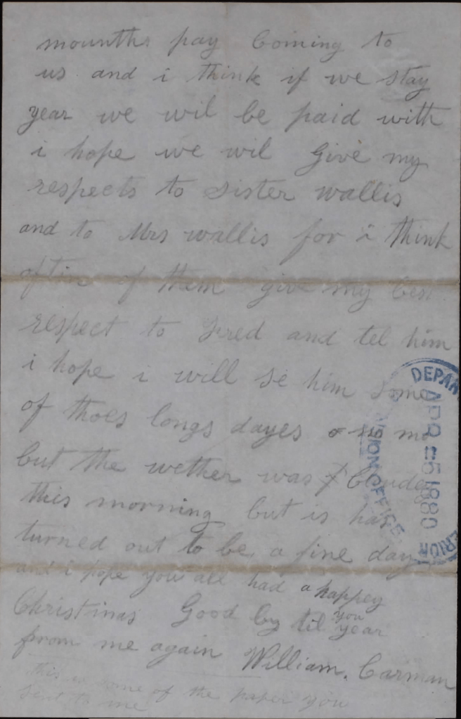 I send my love to you and Josephine and soon as I get paid, I will send you some money. There is four months pay coming to us and I think if we stay here we will get paid. I hope we will. Give my respects to sister Wallace and to Mr. Wallace for I think often of them. Give my best respects to Fred and tell him I hope I will see him some of these days. The weather was coudy this morning but it has turned out to be a fine day and I hope you all had a happy Christmas. Goodbye till you hear from me again, — William Carman