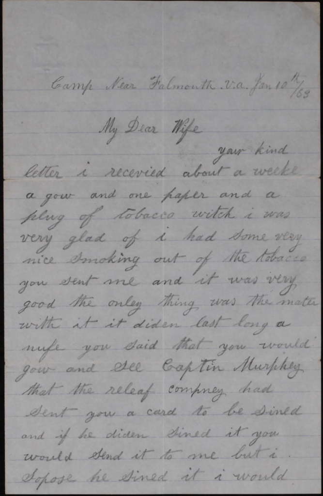 Your kind letter I received about a week ago and one paper and a plug of tobacco you sent me and it was very good. The only thing the matter with it was it didn’t last long enough. You said that you would go and see Capt. O’Murphy that the relief company had sent you a card to be signed and if he didn’t sign it, you would send it to me. But I suppose he signed it. I would have wrote to you sooner but I was waiting to hear from you about the card. You must try and learn when Capt. O’Murphy is coming out so I will get the tobacco he has. I don’t think he will be out here for some time and if he don’t come soon, you can get it and send it by Express if they will bring it. Also send me a pipe to smoke.