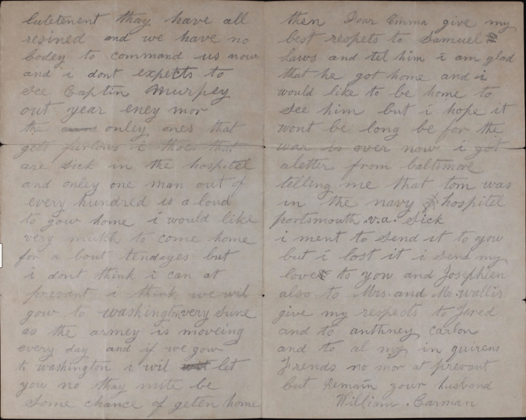 I got a letter from Baltimore telling me that Tom was in the Navy Hospital at Portsmouth, Va. [N. H.] sick. I meant to send it to you but I lost it. I send my love to you and Josephine…No more at present but remain your husband, — William Carman