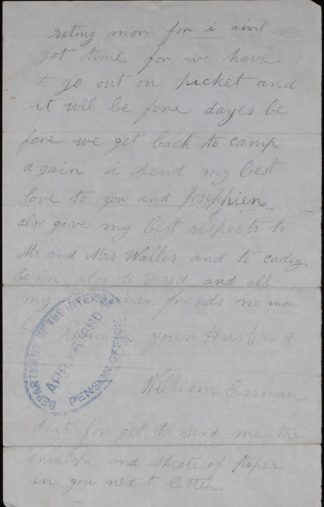 Dear Emma, please send me two or three postage stamps as they are hard to get here and as soon as I get paid, I will send you some money for I know you want it for it vexes me every day for to think that they don’t pay me. I only can send my love to you and Josephine and all my enquiring friends. No more at present, but remain your dear and affectionate husband, — William Carman