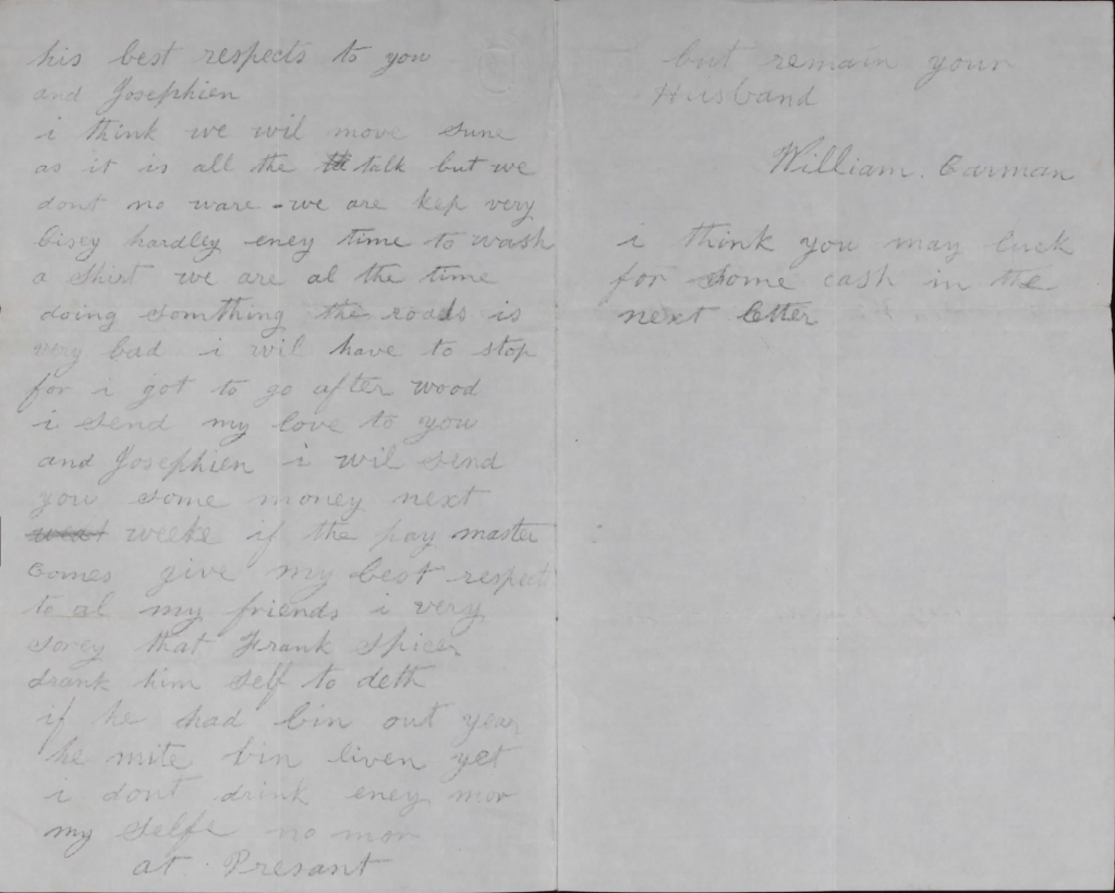 I think we will move soon as it is all the talk but we don’t know where. We are kept very busy. Hardly any time to wash a shirt. We are all the time doing something. The roads is very bad. I will have to stop for I got to go after wood. I send my love to you and Josephine. I will send you some money next week if the pay master comes. Give my best respects to all my friends. I’m very sorry that Frank Spicer drank himself to death. If he had been out here, he might have been living yet. I don’t drink any more. No more at present but remain your husband, — William Carman