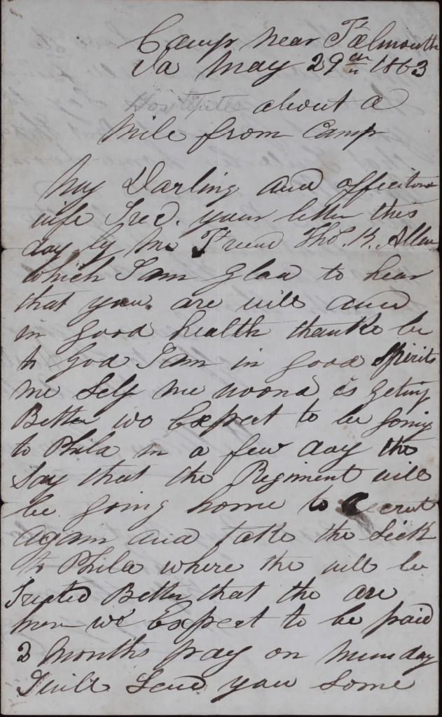 I received your letter this day by my friend Thomas K. Allen which I am glad to hear that you are well and in good health. Thanks be to God, I am in good spirits myself. My wound is getting better. We expect to be going to Philadelphia in a few days. They say that the regiment will be going home to recruit again and take the sick to Philadelphia where they will be treated better than they are here.