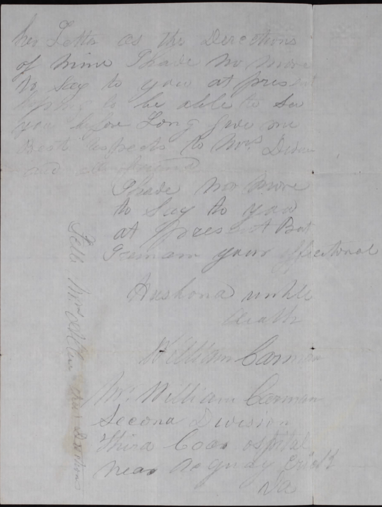 I write these few lines to you hoping to find you in good health only I am not out of bed yet. My furlough I have ready to put in and I hope to get home in a few days. There was two of our regiment went home this day. I have not received them handkerchiefs. I do not know what is the reason, I do not know. Thomas K. Allen is here doing duty at the Provost Marshall’s. He is a great comfort to me. He comes twice a day to see me. Tell his wife he is here and tell her to direct her letter as the directions of mine. I have no more to say to you at present. Hoping to be able to see you before long. Give my best respects to Mrs. Diven and all friends.