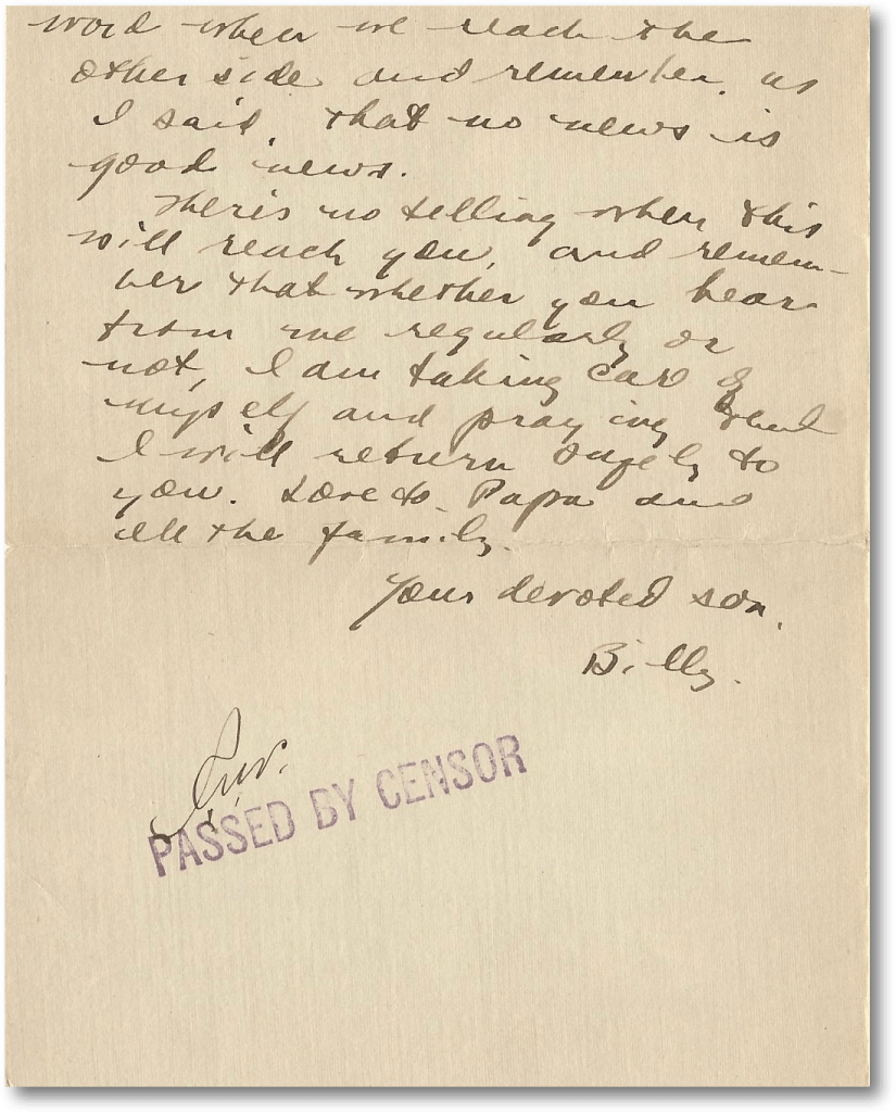 There is no telling when this will reach you and remember that whether you hear from me regularly or not, I am taking care of myself and praying that I will return safely to you. Love to Papa and all the family. Your devoted son, — Billy
