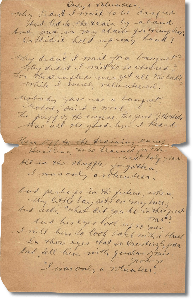 I am enclosing a piece of poetry written by one of the men in my company and I think there’s a bit of truth in it. I copied it while one of our officers was censoring the letter in which it was enclosed. Censoring, by the way, takes up a considerable portion of our time. It’s rather interesting to read other people’s love letters and messages home. Often times they are crude but the sincerity is right there.