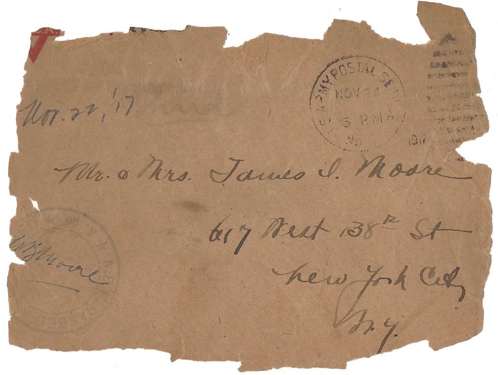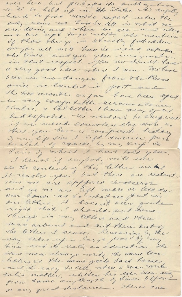I know the absence of detail is tantalizing but we’ve got to live up to censorship regulations whether they are practicable or not. Perhaps some mention of the collision has appeared in the papers. It was published over here but perhaps its publication will be held up in the States. It’s awfully hard to find news to report when the only news we have to tell is what we are doing and where we are and where we are apt to go next. The mention of those things is strictly forbidden so you all will have to read between the lines and use your imagination in that respect. You no doubt have a very good idea where I am. We have been in no danger from the Huns since we landed in port and the two months so far have been spent in very comfortable circumstances besides, a lot better than any of us had expected. We wouldn’t be surprised if we moved somewhere else worse so there you have a composite history of my life since I left America, punctuated of course by my trip to Paris of which I have told you.