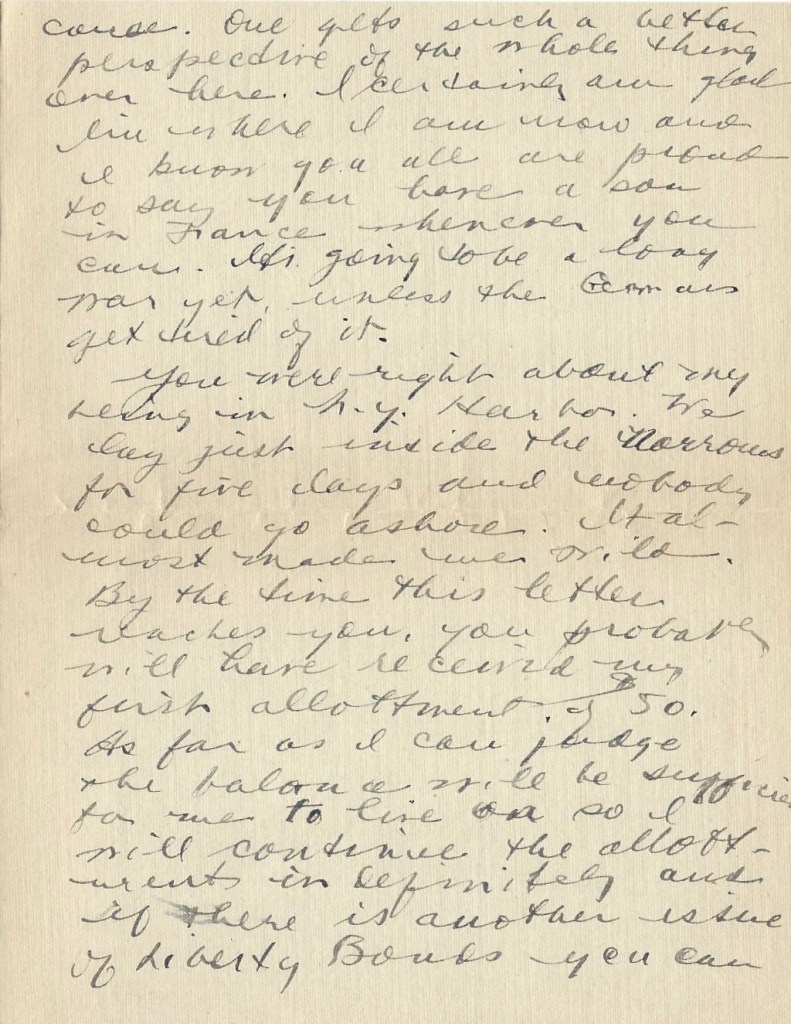 You were right about my being in New York Harbor. We lay just inside the Narrows for five days and nobody could go ashore. It almost made me wild. By the time his letter reaches you, you probably will have received my first allotment of $50. As far as I can judge, the balance will be sufficient for me to live on so I will continue the allotments indefinitely and if there is another issue of Liberty Bonds, you can invest for me.