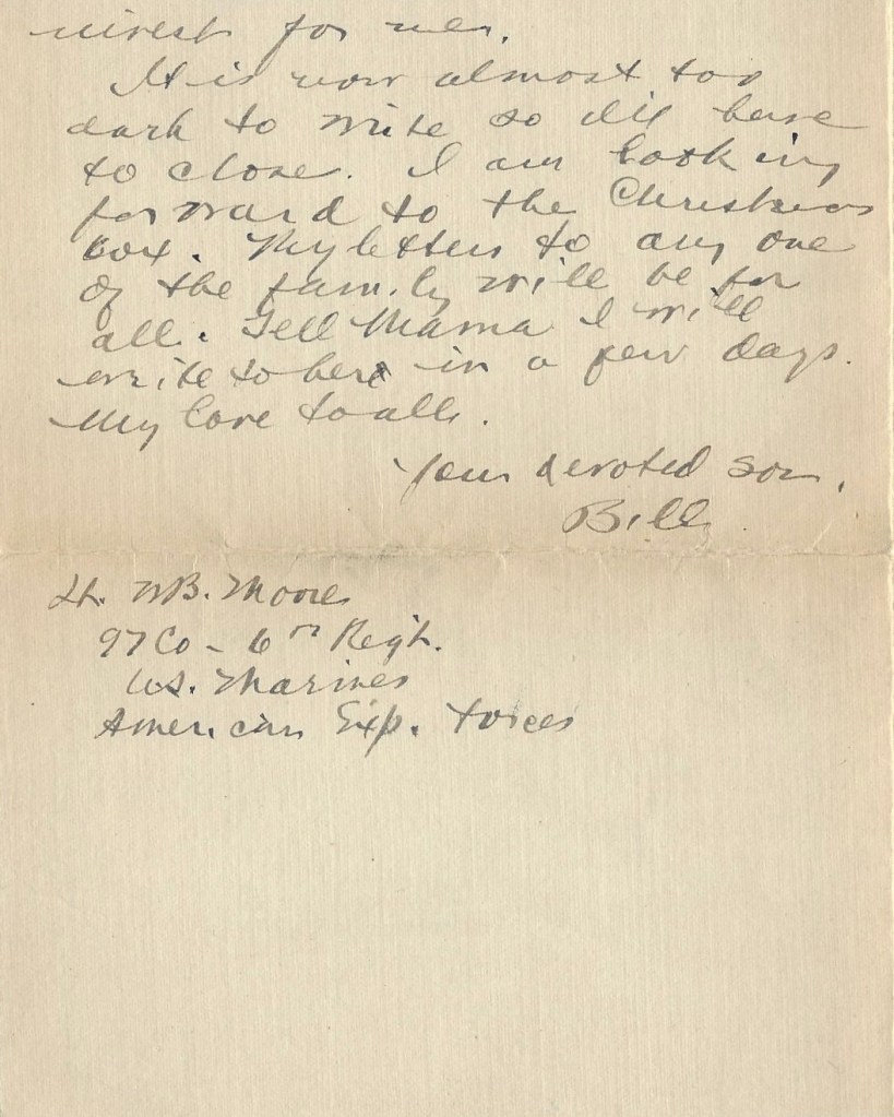 It is now almost too dark to write so I’ll have to close. I am looking forward to the Christmas box. My letters to anyone of the family will be for all. Tell Mama I will write to her in a few days. My love to all. Your devoted son, – Bill