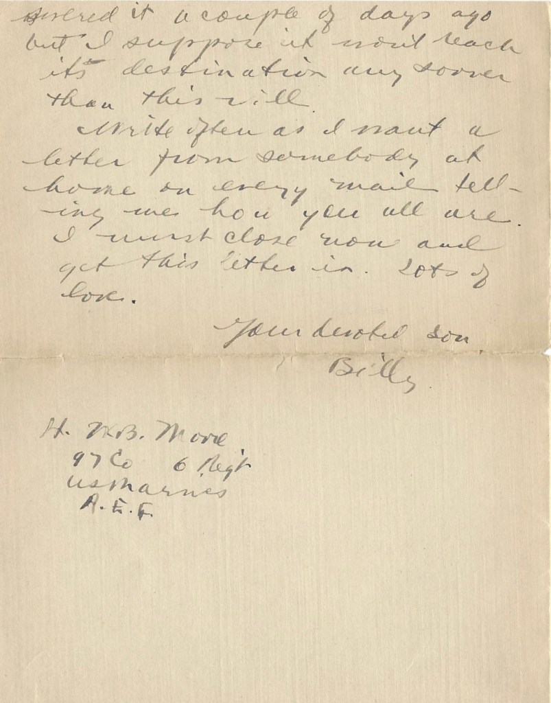 Be sure and write often, all of you at home. My letters to Mama will have to do for the whole family on most occasions, but the more letters I receive from home the happier I’ll be. Some men in my battalion got mail today but I wasn’t one of the fortunate ones. Perhaps mine isn’t due yet. Must close now. Fred sends his love and mine is all for both of you this day. Your devoted son, — Billy