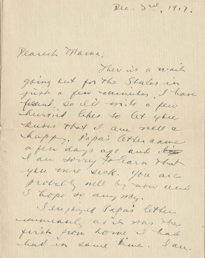 There is a mail going out for the States in just a few minutes I have found so I’ll write a few hurried lines to let you know that I am well and happy. Papa’s letter came a few days ago and I am sorry to learn that you were sick. You are probably well by now and I hope so anyway.