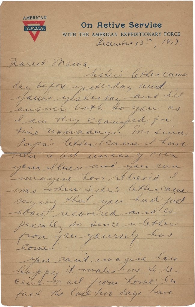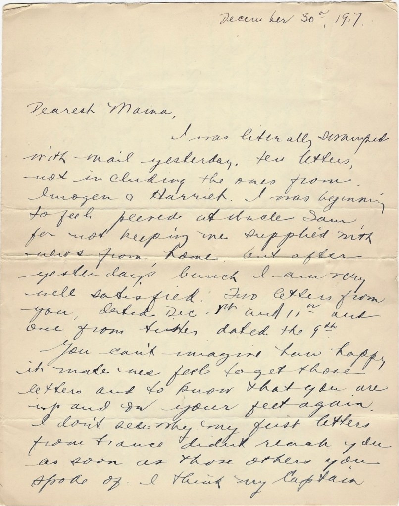 I was literally swamped with mail yesterday, ten letters, not including the ones from Imogen & Harriet. I was beginning to feel peeved at Uncle Sam for not keeping me supplied with news from home, but after yesterday’s bunch, I am very well satisfied. Two letters from you, dated December 1st and 11th, and one from sister dated the 9th. You can’t imagine how happy it made us feel to get those letters and to know that you are up and on your feet again. I don’t see why my first letters from France didn’t reach you as soon as those others you spoke of. I think my Captain was censoring my letters then and he might have held it up for I remember he wasn’t prompt in getting our officer’s mail off. It’s funny that somebody in the church should have heard from a nurse on board the ship; that near death episode she spoke of was the collision I think I wrote you about. It was rather exciting for aw while when we didn’t know just exactly what had happened but there never was any danger of the ship’s sinking and it’s just like one of those nurses to speak of it in such a calamitous way. What is her name and whom does she know in the church?