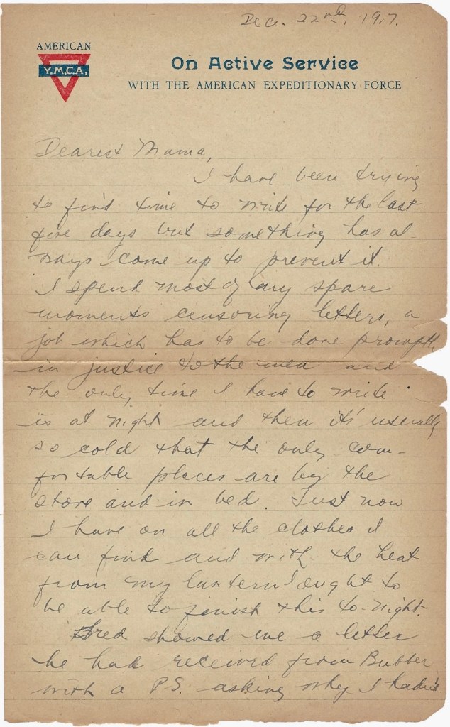 I have been trying to find time to write for the last five days but something has always come up to prevent it. I spend most of my spare moments censoring letters—-a job which has to be done promptly in justice to the men—-and the only time I have to write is at night and then it’s usually so cold that the only comfortable places are by the stove and in bed. Just now I have on all the clothes I can find and with the heat from my lantern I ought to be able to finish this tonight.