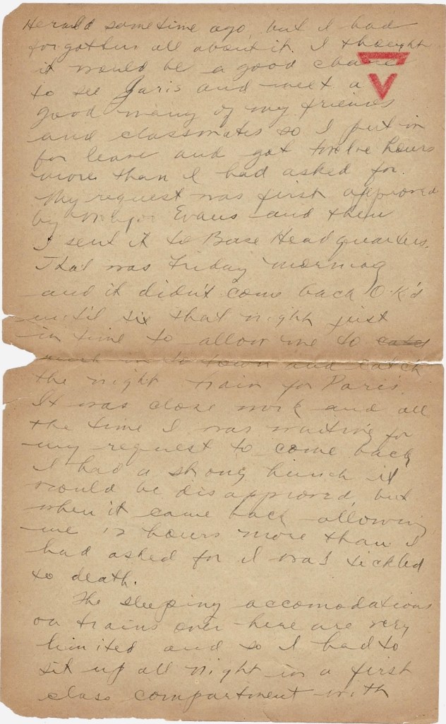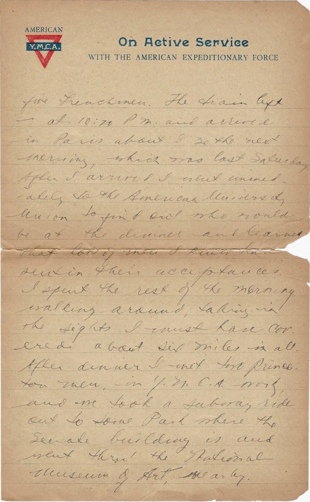 Since I wrote you last, I have enjoyed a trip to Paris. A week ago yesterday morning Fred called my attention to a notice in the New York Herald, Paris Edition, reminding all Princeton men of a Princeton dinner to be held in Paris on the following evening. I had seen an announcement in the Herald some time ago but I had forgotten all about it. I though it would be a good chance to see Paris and meet a good many of my friends and classmates so I put in for leave and got twelve hours more than I had asked for. My request was first approved by Major Evans and then I sent it to Bade Headquarters. That was Friday morning and it didn’t come back ok’d until six that night, just in time to allow me to rush into town and catch the night train for Paris. It was close work and all the time I was waiting for my request to come back. I had a strong hunch it would be disapproved but when it came back allowing me 12 hours more than I had asked for, I was tickled to death.