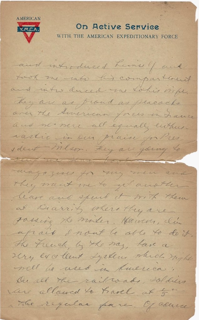 I met a very nice old couple on the train about two hours before the end of the journey. They were New Yorkers, having lived the past five years in France—a Mr. Taylor and his wife. I was standing in the passage way looking out the window when he came up and introduced himself and took me into his compartment and introduced me to his wife. They are as proud as peacocks over the American forces in France and we were all equally enthusiastic in our praise for President Wilson. They are going to send me some books and magazines for my men and they want me to get another leave and spend it with them at Biarritz where they are passing the winter. However, I’m afraid I won’t be able to do it. The French, by the way, have a very excellent system which might well be used in America. On all the railroads, soldiers are allowed to travel at one-fifth the regular fare. Of course French soldiers don’t get as much pay as we do, but it’s a mighty good idea and I wish it had been in effect in the States when I used to make my trips from Quantico to New York.