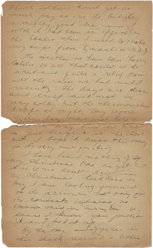 I have heard nothing of my Christmas box as yet but it will no doubt drift in by Christmas. Needless to say, I am looking forward to its arrival, not only for its contents, but also as [Coningsby] Dawson said in “Carry On,” because I know you packed it and tied it up. By the way, an officer in this shack received a letter from a friend of his in New York who said she met sister at Doctor Riley’s. Rather a coincidence, ain’t it?