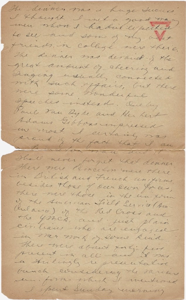 The sleeping accommodations on trains over here are very limited and so I had to sit up all night in a first class compartment with five Frenchmen. The train left at 10:20 p.m. and arrived in Paris about 8:20 the next morning, which was last Saturday. After I arrived I went immediately to the American University Union to find out who would be at the dinner and learned that lots of men I knew had sent in their acceptances. I spent the rest of the morning walking around, taking in the sights. I must have covered about six miles in all. After dinner I met the Princeton men in Y. M. C. A. and we took a subway ride out to some park where the Senate building is and went through the National Museum of Art nearby. The dinner was a huge success I thought. I met a good many men whom I had expected to see and some of my best friends in college were there. The dinner was devoid of the great amount of cheering and singing usually connected with such affairs, but there were some wonderful speeches instead. One by Paul Van Dyke and Herbert Adams Gibbons impressed me most. I certainly was proud of the fact that I am a Princeton man and I shall never forget that dinner. There were Princeton men there in British and French uniforms besides those in the uniform of the American Field Service (Ambulance) of the Red Cross and the YMCA and just plain civilians who are engaged in war work of some kind. There were about forty-five present in all and it was a strikingly representative bunch considering the various uniforms which I mentioned.