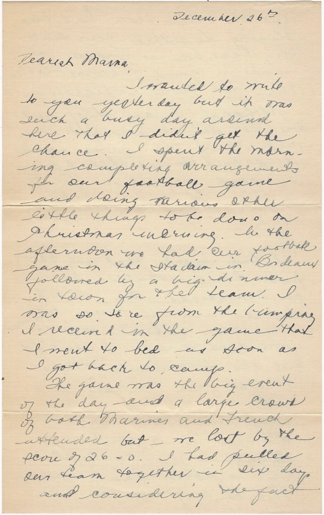 I wanted to write to you yesterday but it was such a busy day around here that I didn’t get the chance. I spent the morning completing arrangements for our football game and doing various other little things to be done on Christmas morning. In the afternoon we had our football game in the stadium in Bordeaux followed by a big dinner in town for the team. I was so sore from the bumping I received in the game that I went to bed as soon as I got back to camp. The game was the big event of the day and a large crowd of both Marines and French attended but we lost by the score of 26–0. I had pulled our team together in six days and considering the fact that the other team had been playing together ever since they had been in France, we made a good showing—better than the score indicated.