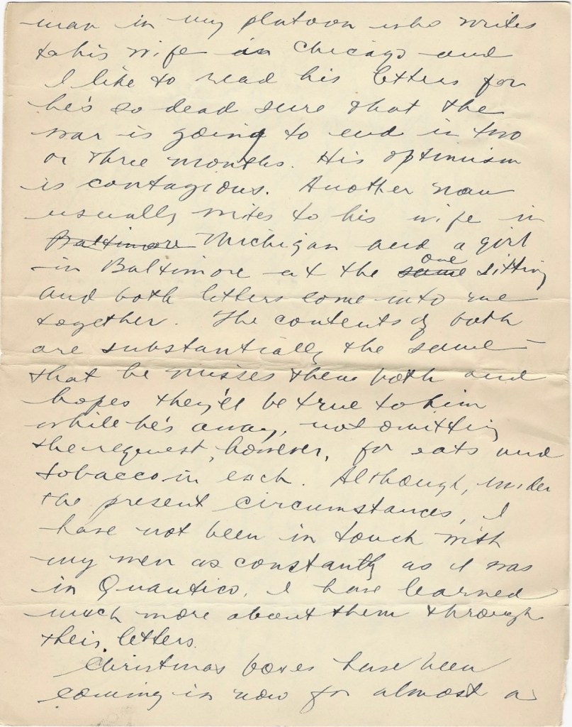 I doubt if anybody will ever see the contents of this letter until it reaches you but there are restrictions we are supposed to observe and as we are left more or less on our honor as to what we put in our letters, it doesn’t seem quite right that I should put some things in my letters and then turn around and cut them out of the letters I censor. Censoring by the way takes up a large part of my time and its really an education, The same men always write the same love letters to the same girls back home and it’s easy to tell when a man writes to his mother, whether he’s ever been away from home any length of time before or any great distance. There’s one man in my platoon who writes to his wife in Chicago and I like to read his letters for he’s so dead sure that the war is going to end in two or three months. His optimism is contagious. Another man usually writes to his wife in Michigan and a girl in Baltimore at the one sitting and both letters come into me together. The contents of both are substantially the same—that he misses them both and hopes they’ll be true to him while he’s away, not omitting the request, however, for eats and tobacco in each. Although under the present circumstances I have not been in touch with my men as constantly as I was in Quantico, I have learned much more about them through their letters.