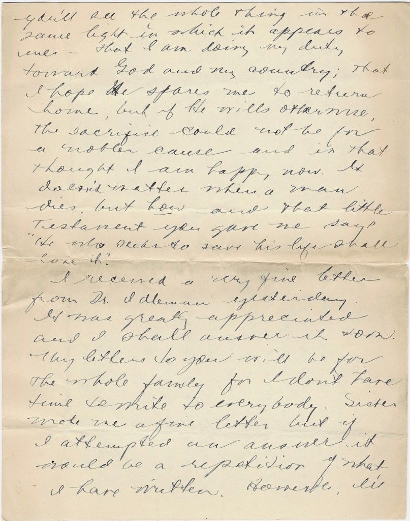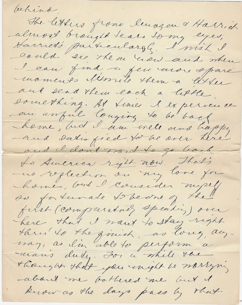 The letters from Imogen & Harriet almost brought tears to my eyes—Harriet’s particularly. I wish I could see them now and when I can find a few more spare moments, I’ll write them a letter and send them each a little something. At times I experience an awful longing to be back home, but I am well and happy and satisfied to be over here and I don’t want to go back to America right now. That’s no reflection on my love for home, but I consider myself so fortunate to be one of the first (comparatively speaking) over here that I want to stay right through to the finish—as long, anyway, as I’m able to perform a man’s duty. For a while the thought that you might be worrying about me bothered me but I know as the days pass by that you’ll see the whole thing in the same light in which it appears to me—that I am doing my duty toward God and my country; that I hope He spares me to return home. But if He will otherwise, the sacrifice could not be for a nobler cause and in that thought I am happy now. It doesn’t matter when a man dies, but how—and that little testament you gave me says, “He who seeks to save his life shall lose it.”