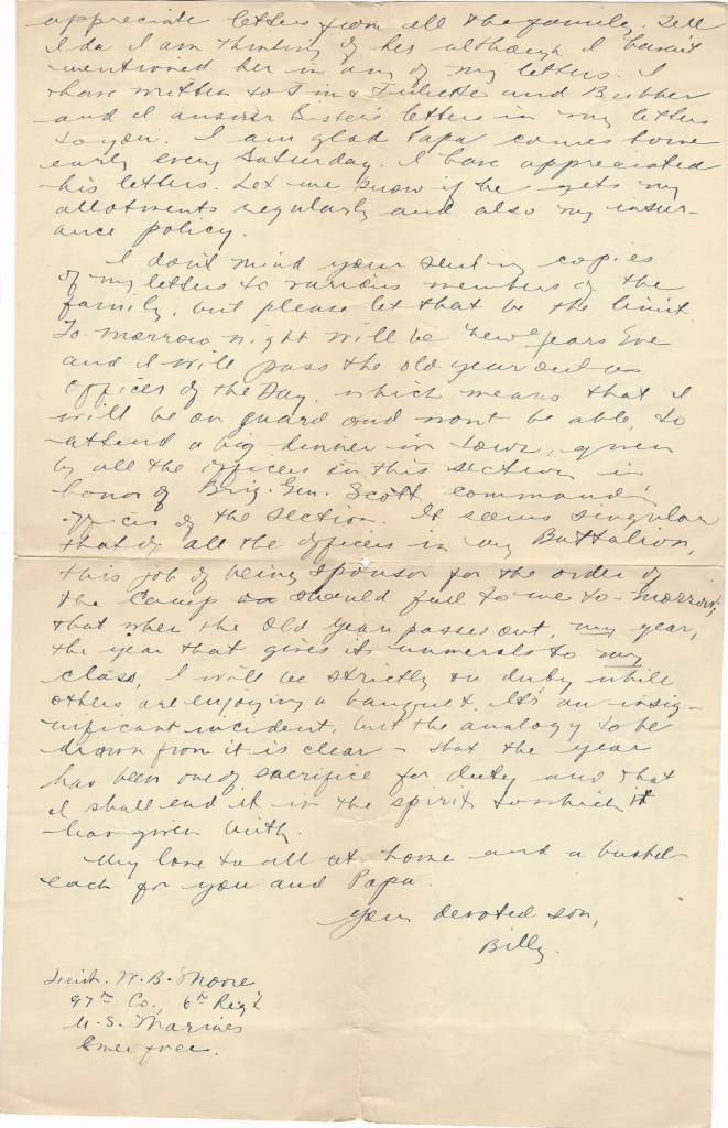 I don’t mind your sending copies of my letters to carious members of the family but please let that be the limit. Tomorrow night will be New Years Eve and I will pass the old year out as Officer of the Day which means that I will be on guard and won’t be able to attend a big dinner in town given by all the officers in this section in honor of Brig. Gen. Scott, commanding officer of the section. It seems singular that of all the officers in my Battalion, this job of being sponsor for the order of the camp should fall to me tomorrow; that when the old year passes out, my year—the year that gives its numerals to my class, I will be strictly on duty while others are enjoying a banquet & it’s an insignificant incident, but the analogy to be drawn from it is clear—that the year has been one of sacrifice for duty and that I shall end it in the spirit to which it has given with.