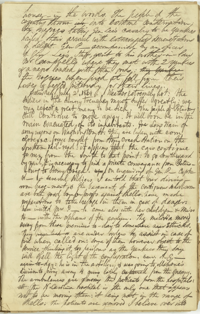 Saturday, July 2nd 1864—Weather extremely hot. The soldiers in the sunny trenches must suffer greatly. We may expect a great many to be sick. The people of Petersburg still continue to move away. It will soon be in the main evacuated of its inhabitants, Long train of army wagons on Washington Street. They are laden with corn, clover, &c. forage brought from Stone Creek Station on the Southern railroad. It appears that the cars continue to run from the South to that point. To go southward by rail, it is necessary to find a private conveyance from Petersburg to Stony Creek. On enquiring of Gen. P[ickett], Capt. W and several soldiers, I am told that our dining room basement & the basement of the continuous schoolroom are both good bomb proofs against shells. Have made preparations to take refuge in them in case of danger. Have invited Mrs. P to come also with her children and Miss H. with the orphans of the asylum. The militia moved away from these premises today somewhere near Ettricks. they are under orders to assist in case of fire when called on. Some of them, however, object to the service thinking it too perilous as the Yankees will shell the light of the conflagration. Saw A. S. again today. He is in the artillery & was going to Mahone’s Division to bring away 4 guns lately captured from the enemy.