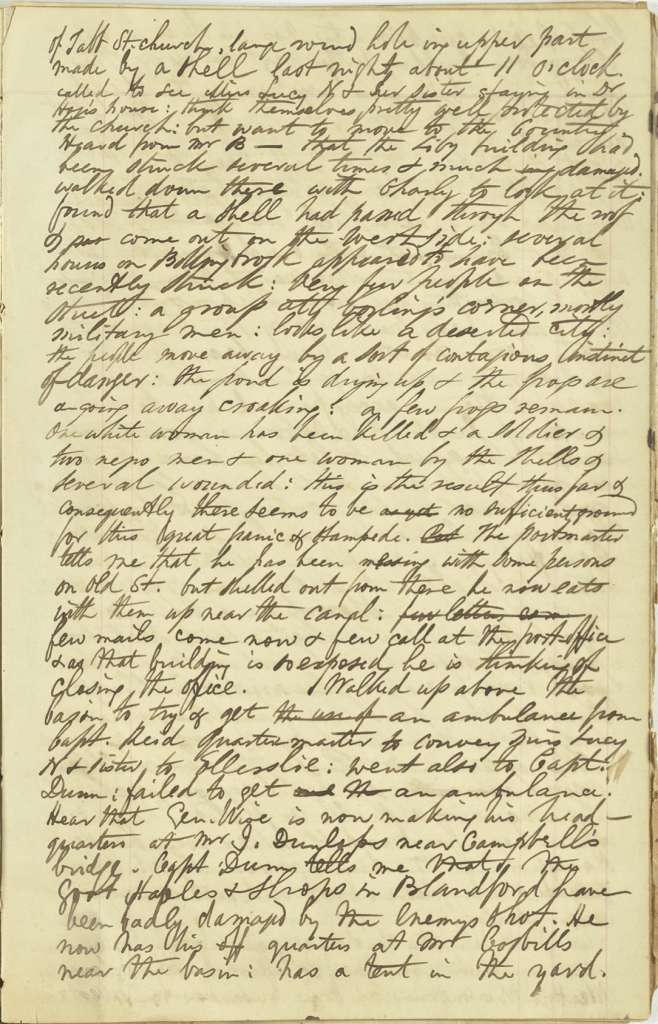 Went down to Dr. [William J.] Hoge’s house on Tabb Street. Saw a hole on west side of Tabb Street [Presbyterian] Church. Large round hole in upper part made by a shell last night about 11 o’clock. Called to see Miss Lucy N & her sister staying in Dr. Hoge’s house. Think themselves pretty well protected by the church but want to move to the country.