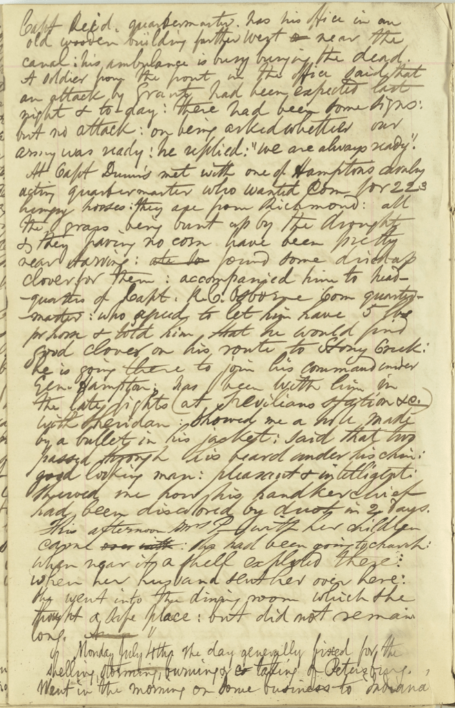 At Capt. Dunn’s, met with one of Hampton’s cavalry acting quartermaster who wanted corn for 223 hungry horses. They are from Richmond. All the grass very burnt up by the drought and they having no corn have been pretty near starving. Found some dried up clover for them. Accompanied him to headquarters of Capt. R. C. Osborne, commissary quartermaster, who agreed to let him have 5 lbs. per horse and told him that he would find good clover on his route to Stony Creek. He is going there to join his command under Gen. Hampton. Has been with him in the late fights (at Trevilian’s Station, &c.) with Sheridan. Showed me a hole made by a bullet in his jacket. Said that two passed through his beard under his chin. Good looking man—pleasant and intelligent. Showed me how his handkerchief had been discolored by dust in two days.