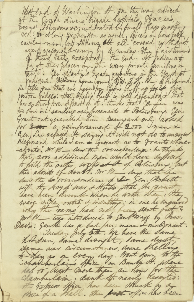 Monday, July 4th—The day generally fixed for the shelling, storming, burning, and taking of Petersburg. Went in the morning on some business to Indiana [Street] at the west end of Washington Street. On the way noticed at the grove divers brigade hospitals—Gracie’s, Evans’, Johnson’s, &c., indicated by small flags, mostly red. Along Washington as usual, officers on horseback, cavalrymen, foot soldiers, all covered with dust, army wagons drawn by 4 mules—the hair trimmed off their tails except at the end. At Indiana [Street] and at other places on the way, private families in tents. Gen. [James Green] Martin’s headquarters in the yard at Indiana.