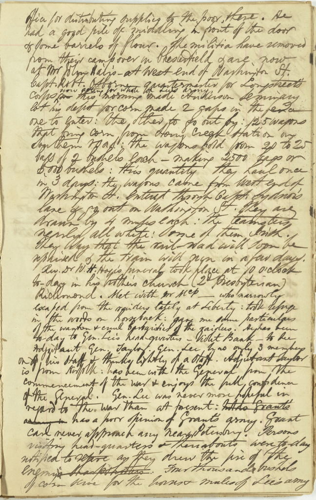 The miltia have removed from their camp over in Chesterfield & are now at Mr. John Hair’s at west end of Washington Street. Capt. Robert Osborne, quartermaster for Longstreet’s Corps, now acting for whole of Lee’s army, this morning made Anderson Seminary lot his depot for corn. Made two gaps in the fence—one to enter, the other to go out by. 125 wagons that bring corn from Stony Creek Station on Southern road. The wagons hold from 20 to 25 bags of 2 bushels each making 2500 bags or 5,000 bushels. This quantity they haul once in three days. The wagons came from west end of Washington Street, entered through Capt. Sydnor’s lane and go out on Washington Street. They are drawn by 4 mules each. the teamsters nearly all white. Some of them Irish. They say that the railroad will soon be repaired and the train will run in a few days.