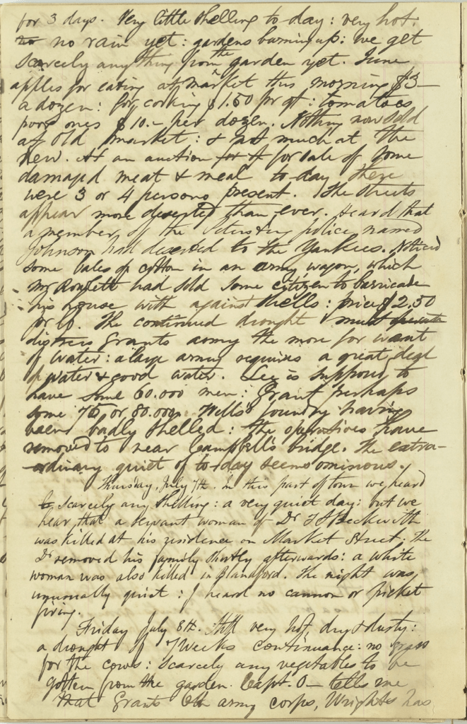 Thursday, July 7th—In this part of town we heard scarcely any shelling. A very quiet day. But we hear that a servant woman of Dr. T[homas] S[tanley] Beckwith was killed at his residence on Market Street. The Dr. removed his family shortly afterwards. A white woman was also killed in Blandford. The night was unusually quiet. I heard no cannon or picket firing.