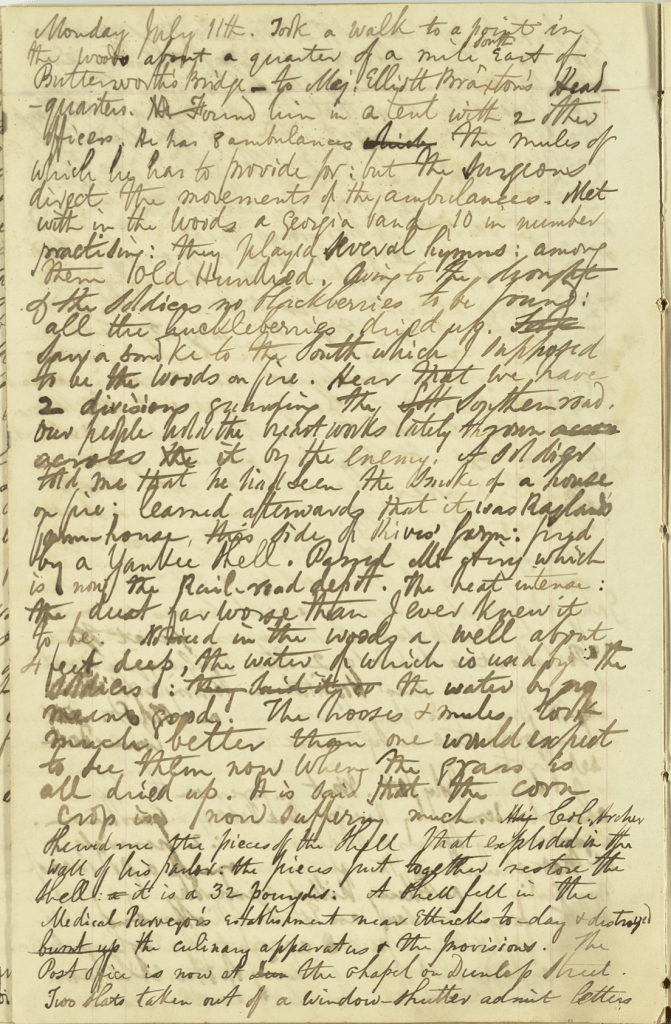 Monday, July 11th—Took a walk to a point in the woods about a quarter of a mile southeast of Butterworth’ Bridge to Maj. Elliott Braxton’s Headquarters. Found him in a tent with two other officers. He has 8 ambulances the mules of which he has to provide for but the surgeons direct the movements of the ambulances. Met with in the woods a Georgia band, ten in number, practicing. They played several hymns, among them Old Hundred. Owing to the drought & the soldiers, no blackberries to be found. All the blackberries dried up. Saw smoke to the south which I supposed to be the woods on fire. Hear that we have two divisions guarding the Southern road. Our people hold the breastworks lately thrown across it by the enemy. A soldier told me that he had seen the smoke of a house on fire. Learned afterwards that it was Ragland’s farmhouse, this side of Rives’ farm, fired by a Yankee shell. Passed Mt. Airy which is now the railroad depot.