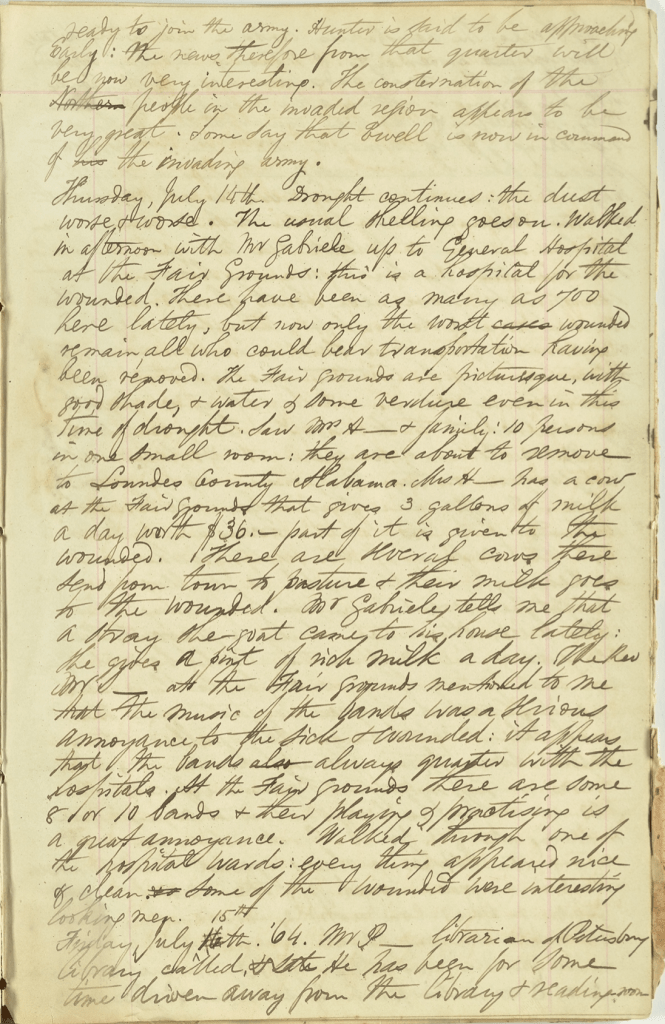 Thursday, July 14th—Drought continues; the dust worse and worse. The usual shelling goes on. Walked in afternoon with Mr. Gabriele up to General Hospital at the fairgrounds. This is a hospital for the wounded. There have been as many as 700 here lately, but now only the worst wounded remain—all who could bear transportation having been removed. The fairgrounds are picturesque with good shade & water and some verdure even in this time of drought. Saw Mrs. H & family. 10 persons in one small room. They are about to remove to Loundes county, Alabama. Mrs. H has a cow at the fairgrounds that gives 3 gallons of milk a day worth $36—part of it given to the wounded. Mr. Gabriele tells me that a stray she-goat came to his house lately. She gives a pint of rich milk a day. The Rev. Mr. S at the fairgrounds mentioned to me that the music of the bands was a serious annoyance to the sick and wounded. It appears that the bands always quarter with the hospitals. At the fairgrounds there are some 8 or 10 bands and their playing and practicing is a great annoyance. Walked through one of the hospital wards. Everything appeared nice and clean. Some of the wounded were interesting looking men/