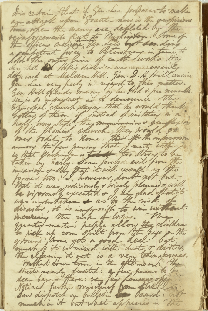 The weather is fine now. The dust is now laid. Fine breezes blowing from the northwest. The firing last night was from mortars. The very large gun is said to be on a Yankee battery. It is said that Beauregard is mining towards the enemy’s lines; that 100 men are detailed at night to work on the mine; that the superincumbent earth is propped up and supported by posts as the mine is extended. It is also said that Beauregard has had wells dug & men put at the bottom of them to listen for mining noises of the enemy. The report of Grant’s death is still repeated & harped upon although it appears to be without any foundation.