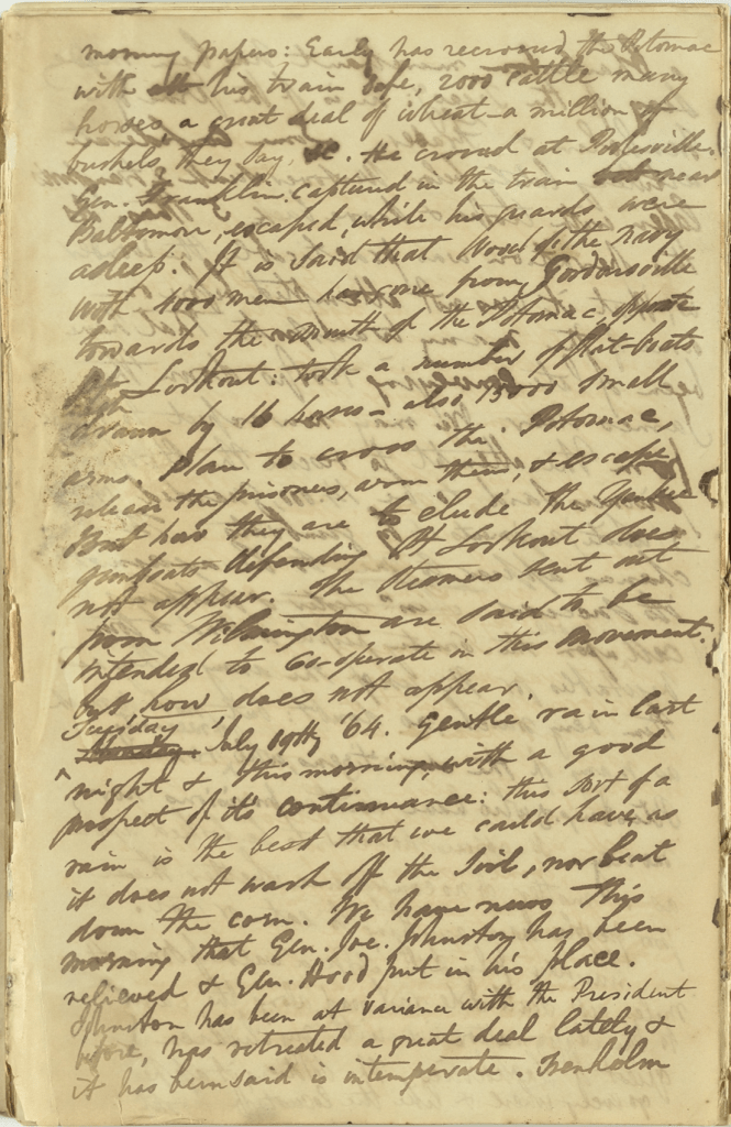 Monday, July 18th 1864—The picket firing appeared to be kept up during the whole of last night. It is said by officers from the front that some important movement is meditated by Gen. Lee to take place in a few days. Cooked rations have been prepared, they say, for Hill’s Corps. Some say that our batteries enfilade the enemy’s lines but this is doubted.