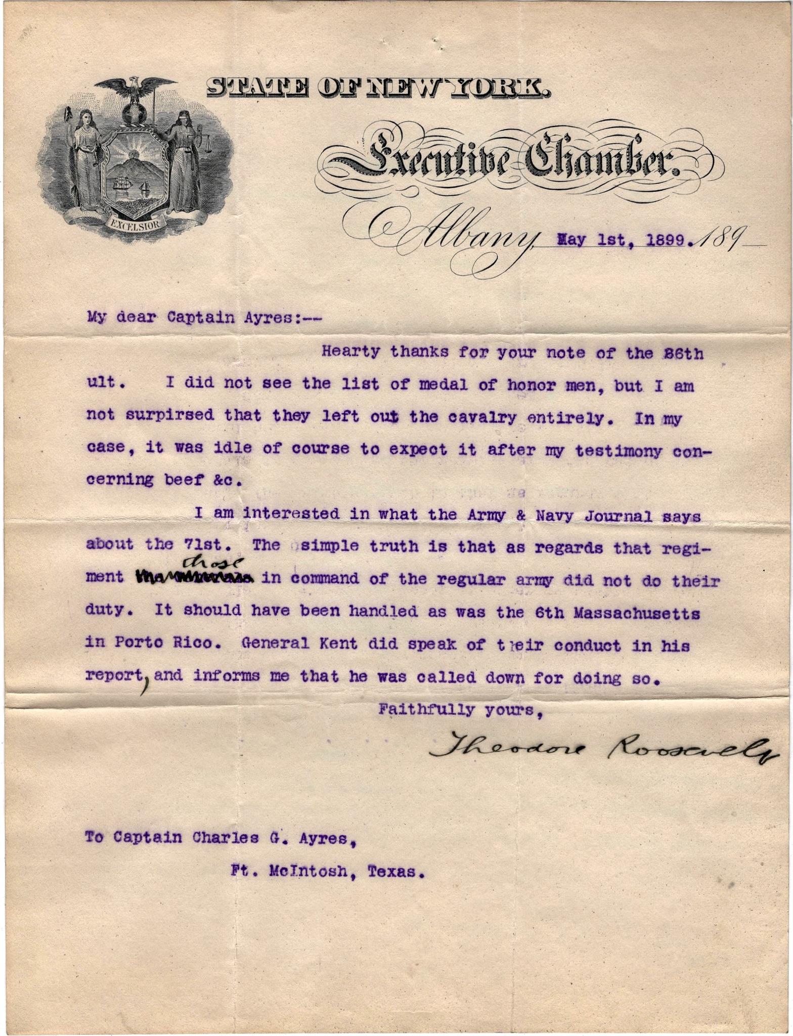 Thursday, 24—Letter from home. Answered it. Went to the City in the ambulance and returned with Harry who has gone home. Went to 2nd [ ] Off. told to call at 12 M tomorrow. Wrote to Curnier. Saw Ed House and Capt. Hamilton, 1st New York D.