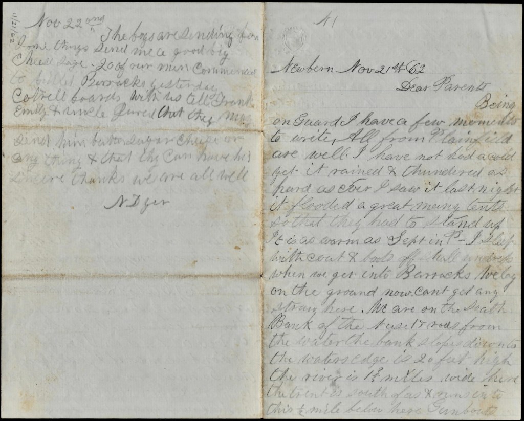 Being on guard, I have a few moments to write. All from Plainfield are well. I have not had a cold yet. It rained and thundered as hard as ever I saw it last night. It flooded a great many tents so that they had to stand up. It is as warm as September in Plainfield. I sleep with coat and boots off. Shall undress when we get into barracks, We lay on the ground now. Can’t get any straw here. We are on the south bank of the Neuse [river] 15 rods [~80 yards] from the water. The bank slopes down to the water’s edge is 20 feet high. The river is 1 3/5 miles wide here. The Trent [river] is south of us and runs into this half mile below here. Gunboats are on both rivers. The pickets were fired into two days before we got here & the troops were ordered out & before morning the rivers had 16 gunboats on them. There is two large forts between the rivers. The boats & forts can keep off 50,000 men.