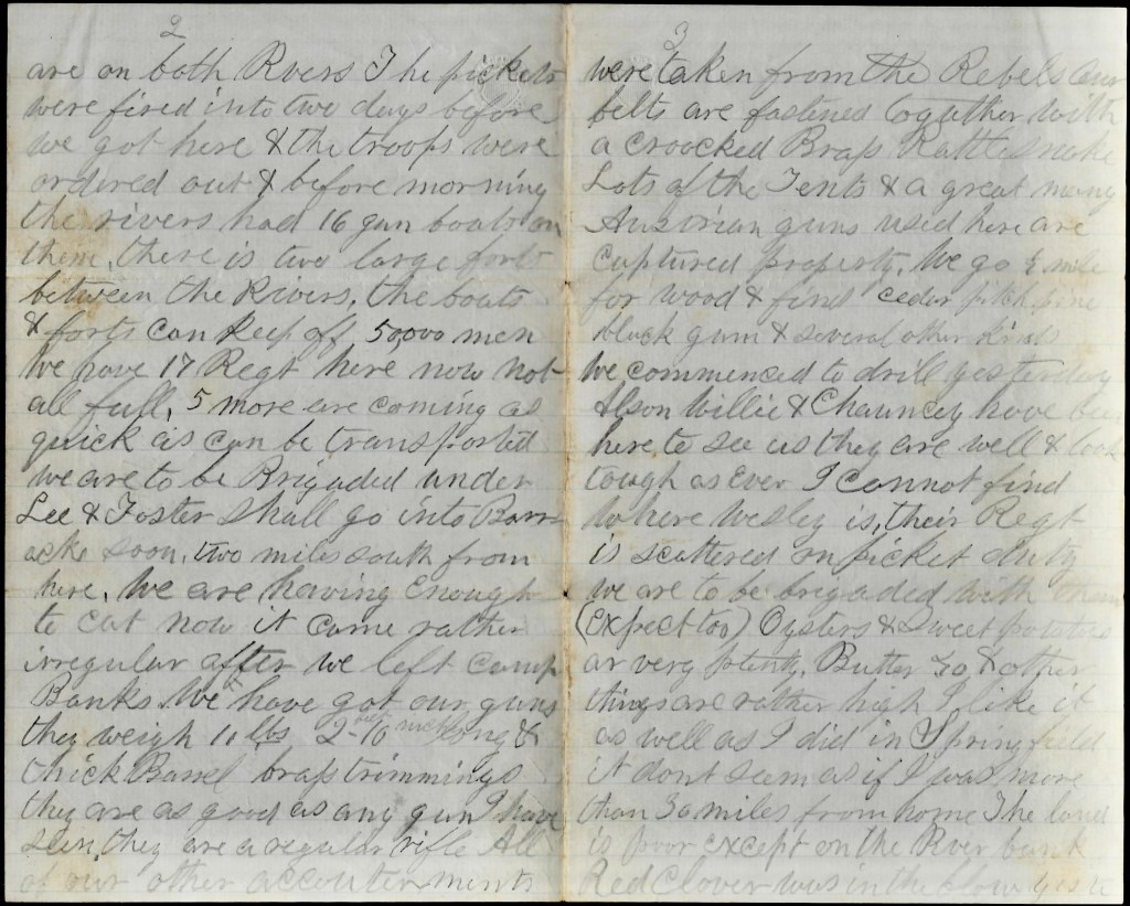 We have 17 regiments here now, not all full. Five more are coming as quick as can be transported. We are to be brigaded under Lee & Foster. Shall go into barracks soon two miles south from here. We are having enough to eat now. It came rather irregular after we left Camp Banks. We have got our guns. They weigh 11 lbs, two feet, 10 inches long and thick barrel brass trimmings. They are as good as any gun I have seen. They are a regular rifle. All of our other accoutrements were taken from the Rebels. Our belts are fastened together with a crooked brass rattlesnake. Lots of the tents & a great many Austrian guns used here are captured property. We go half mile for wood & find cedar pitch pine, black gum and several other kinds.