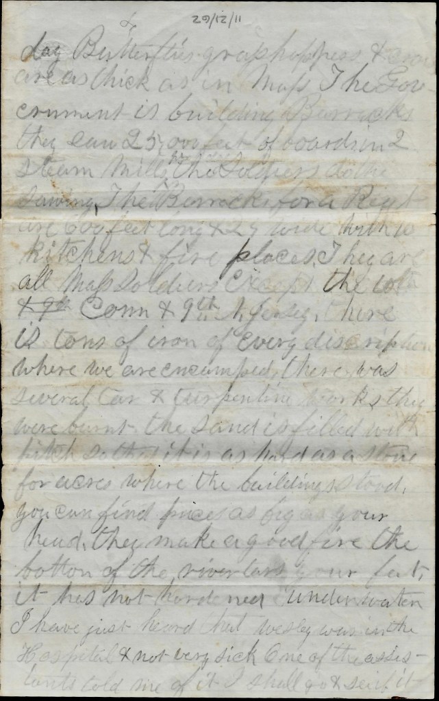 Oysters and sweet potatoes are very plenty. Butter 40 cents and other things are rather high. I like it as well as I did in Springfield. It don’t seem as if I was more than 30 miles from home. The land is poor except on the river bank. Red clover was in the blow yesterday. Butterflies, grasshoppers, and crows are thick as in Massachusetts. The government is building barracks. They saw 25,000 feet of boards in two steam mills, The soldiers do the sawing. The barracks for a regiment are 600 feet long & 24 wide with 10 kitchens & fireplaces. They are all Massachusetts soldiers except the 10th Connecticut and 9th New Jersey. There is tons of iron of every description where we are encamped. There was several tar and turpentine works. They were burnt. The sand is filled with pitch so that it is as hard as a stone for acres where the buildings stood. You can find pieces as big as your head. They make a good fire. The bottom of the river tars your feet. It is not hardened under water.