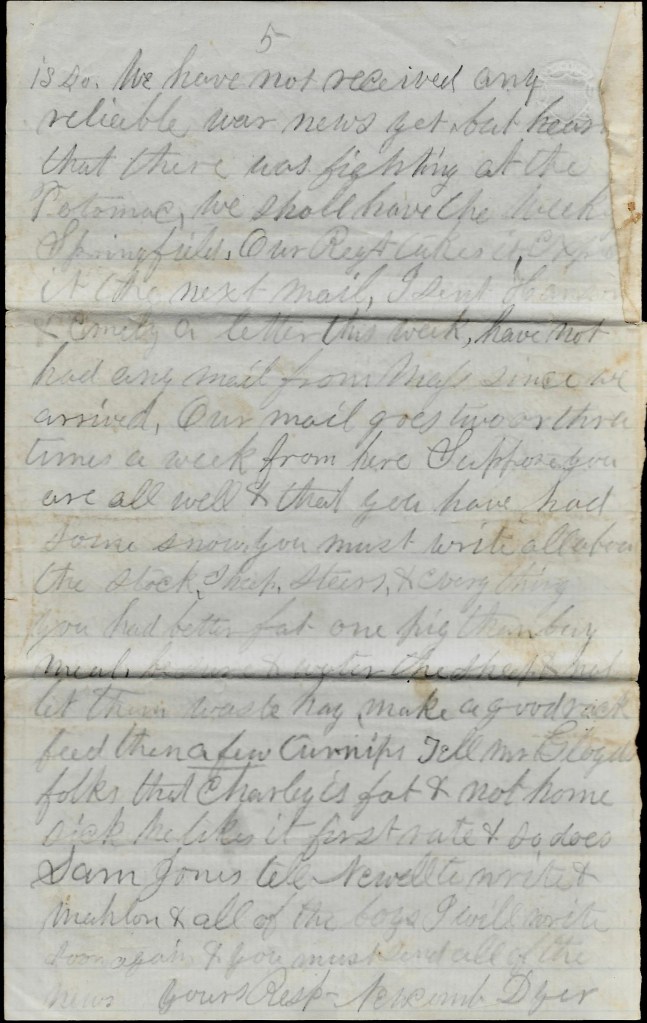 I have just heard that Wesley was in the hospital & not very sick. One of the assistants told me of it. I shall go and see if it is so. We have not received any reliable war news yet but hear that there was fighting at the Potomac. We shall have the weekly Springfield [paper]. Our regiment takes it. Expect it in the next mail. I sent Hanson and Emily a letter this week. Have not had any mail from Massachusetts since we arrived. Our mail goes two or three times a week from here. Suppose you are all well and that you have had some snow. You must write all about the stock, sheep, steers, and everything. You had better fat one pig than buy meal. Be sure to water the sheep & not let them waste hay. Make a good rack, Feed them a few turnips. Tell Mr. Gloyd’s folks that Charley is fat and not homesick. He likes it first rate & so does Sam Jones. Tell Newell to write & Mahlon & all of the boys. I will write soon again & you must send all of the news. Yours respectfully, – Newcomb Dyer