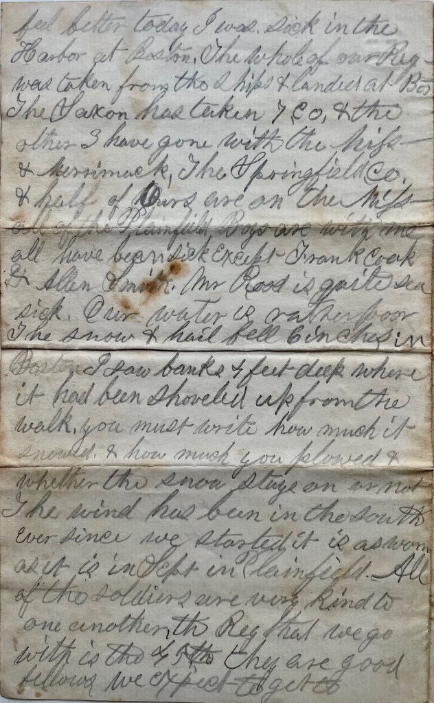 The snow and hail fell six inches in Boston. I saw banks 4 feet deep where it had been shoveled up from the walk. You must write how much it snowed & how much you plowed & whether the snow stays on or not. The wind has been in the south ever since we started. It is as war as it is in September in Plainfield. All of the soldiers are very kind to one another. The regiment that we go with is the 45th. They are good fellows. We expect to get to Beaufort tomorrow. You may send me some stamps. We could not get any good ones at Springfield. I have ordered 8 dollars of my pay to be sent home. You can get it when it comes. Five a month will be all that I shall be apt to want. I shall send a letter to W____ and Mary Ann when I get to Newbern. I will write some more when I get there.