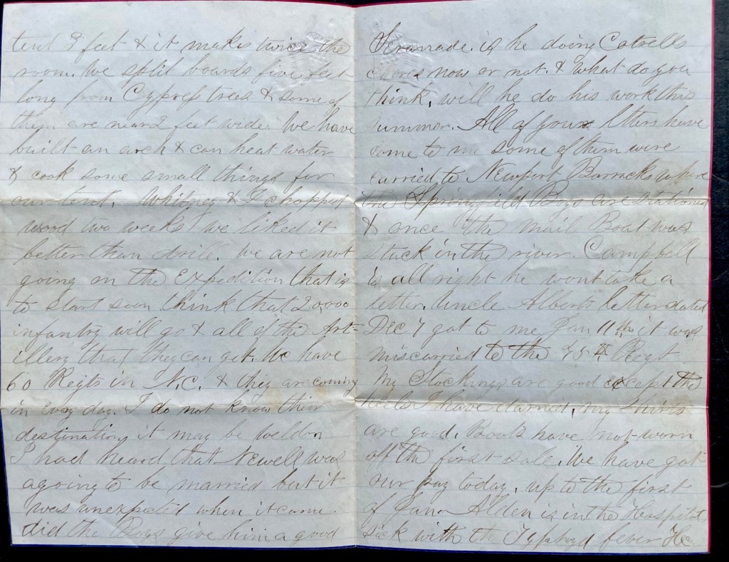 I had heard that Newell was a going to be married but it was unexpected when it came. Did the Boys give him a good serenade? Is he doing [George] Cottrell’s chores or not? And what do you think—will he do his work this summer? All of your letters have come to me. Some of them were carried to Newport Barracks where the Springfield Boys are stationed & once the mail boat was stuck in the river. Campbell is all right. He won’t take a letter. Uncle Albert’s letter dated December 7th got to me January 11th. It was miscarried to the 45th Regiment.