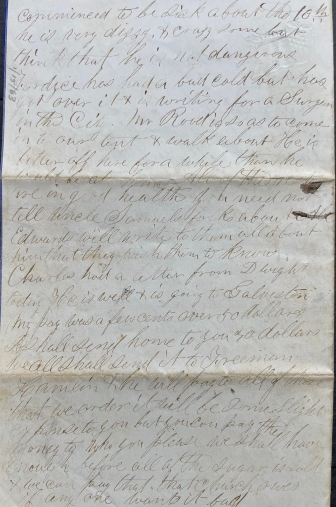 Charlie had a letter from Dwight today. He is well & is going to Galveston. My pay was a few cents over 50 dollars. I shall send home to you 40 dollars. We all shall send it to Freeman Hamlin & he will pay to all of those that we order. It will be some slight expense to you but you can pay the money to who you please. We shall have enough before all of the sugar is sold & we can pay that that church owes if anyone wants it back.