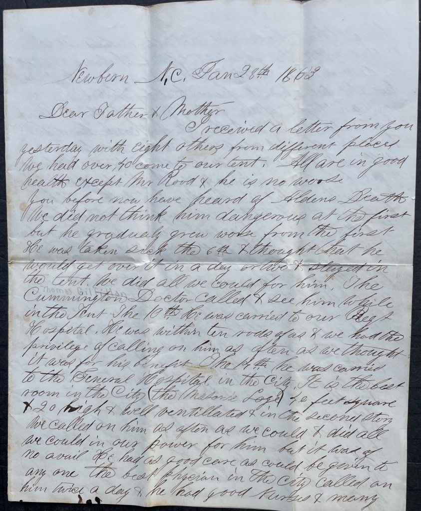 You before now have heard of [cousin] Alden [H. Dyer]’s death. We did not think him dangerous at the first but he gradually gre worse from the first. He was taken sick the 6th and thought that he would get over it in a day or two & stayed in the tent. We did all we could for him. The Cummington doctor [Thomas Gilfillan?] called & see him while in the tent. The 10th he was carried to our regimental hospital. He was within ten rods of us & we had the privilege of calling on him as often as we thought it was for his benefit. The 14th he was carried to the General Hospital in the City (the Masonic Lodge), 40 feet square and 20 high & well ventilated, and in the second story we called on him as often as we could and did all we could in our power for him. But it was of no avail. He had as good care as could be given to anyone. The best physician in the city called on him twice a day and he had good nurses and many things that he could not have had at home. It was with the greatest efforts that we could send home his body. There was a time that we thought we should have to bury him. You can think of our feeling & sympathy for Uncle Samuel’s family & Nellie. It will come hard for them. We do not realize it as we would in a different place & under circumstances that did not bring it continually with the dead and dying. It would be but a mockery to tell them of his kindness to all & the many friends that he has that daily miss his ever welcome company & cheerful way. He was the fattest and most healthy that ever I saw him. If he had lived, he would have been Orderly Sergeant. We are to choose today an Orderly & a 1st Lieutenant.