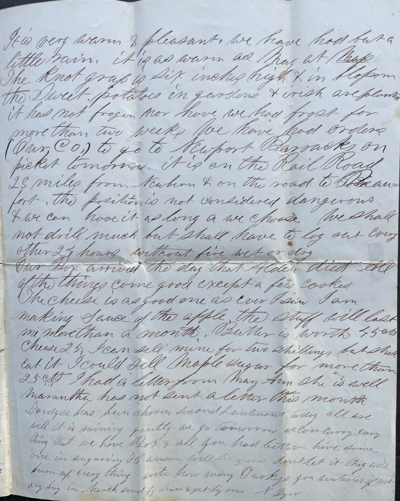 Our box arrived the day that Alden died. All of the things come good except a few cookies. The cheese is as good one as ever I saw. I am making sauce of the apple. The stuff will last me more than a month. Butter is worth 45 cents, cheese 25. I can sell mine for two shillings but shall eat it. I could sell maple sugar for more than 25 cents. I had a letter from Mary Ann. She is well. Marantha has not sent a letter this month. Fordyce has been chosen 2nd Lieutenant today. All are well. It is raining gently. We go tomorrow. We can carry everything that we have, box and all. You had better hire someone in sugaring. Hanson will be good. Don’t let it. They will burn up everything. Write how many turkeys you wintered. If not any, buy in March. Send by Sears and get big ones. — N. Dyer