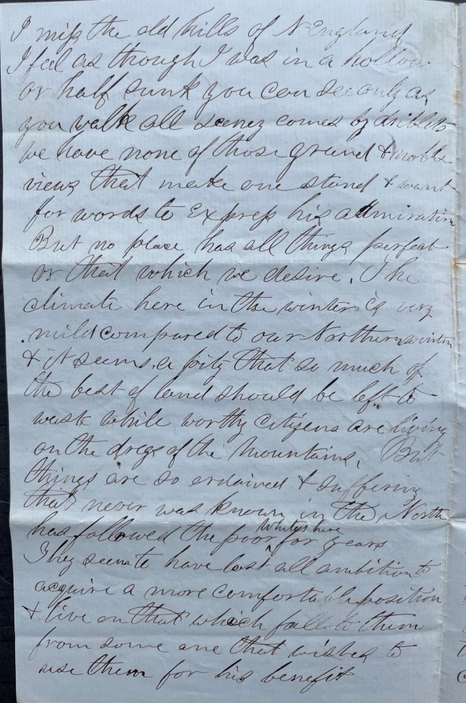 Today finds me writing although I have nothing of interest to communicate, having nothing but our daily routine of duties which we have become accustomed to that we feel entirely destitute of exercise or excitement that is agreeable. At times like these we do not depend on the comforts and position we retain but draw a great share of our happiness from the remembrance of the days spent in Massachusetts. Here we are thrown wholly from some portions of society, our habits changed & climate different from our own & scenery new to us. As I look away, I miss the old hills of New England. I feel as though I was in a hollow or half sunk. You can see only as you walk all scenery comes by driblets. We have none of those grand and noble views that make one stand and want for words to express his admiration. But no place has all things perfect or that which we desire. The climate here in the winter is very mild compared to our Northern winter & it seems a pity that so much of the best of land should be left to waste while worthy citizens are living on the dregs of the mountains.
