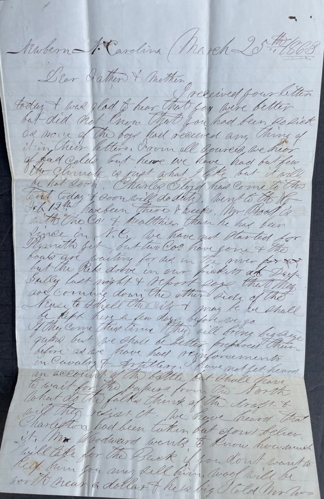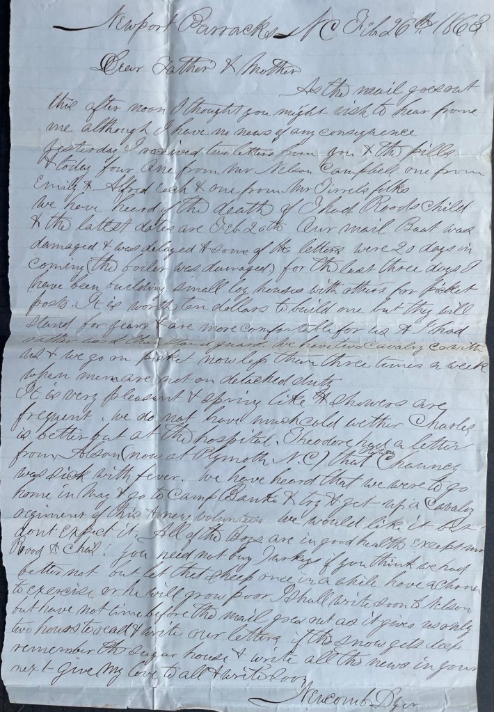 So far I like a soldier’s life far better than I expected to. Have had but one cold & that through carelessness. Strawberries are in blossom & peaches & cherries were a month ago. The weather is getting rather warm but dress accordingly. Expect to go to Plymouth this afternoon as two of our companies went several days ago. The town is on the Roanoke River 160 miles from here. Think that we are to build forts and maybe fight some. We like to move. It kills time faster. C[harles] Gloyd is well and Mr. Rood better than any time since in the South. All others are well now. Write all the little news & accept of my thanks for your other long & interesting letter and I will close with the expectation of hearing from you soon. Yours respectfully, – N. Dyer